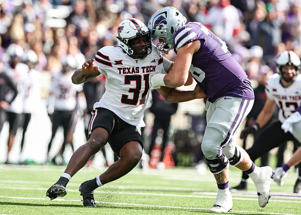 Edge David Bailey, Texas Tech: Bailey’s first step is just stupid—the Kansas State right tackle had no chance yesterday. While he finished with just one sack (and now has 11.5 on the season, first in the nation) and one tackle for loss, Bailey impacted Avery Johnson throughout the game. Bailey was the 17th overall player and fourth-ranked edge on my midseason big board.
